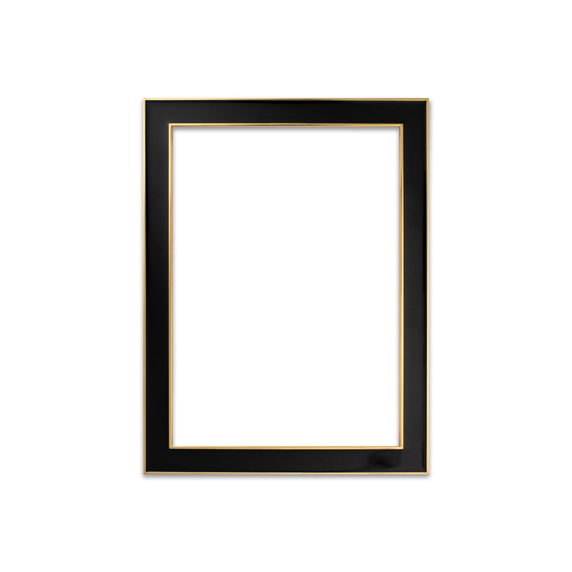 This modern tabletop picture frame is a stylish way to display your favorite memories. Featuring a black enamel ½” border finished with gold trim and gray velvet backing, this frame can accommodate both landscape and portrait photos.