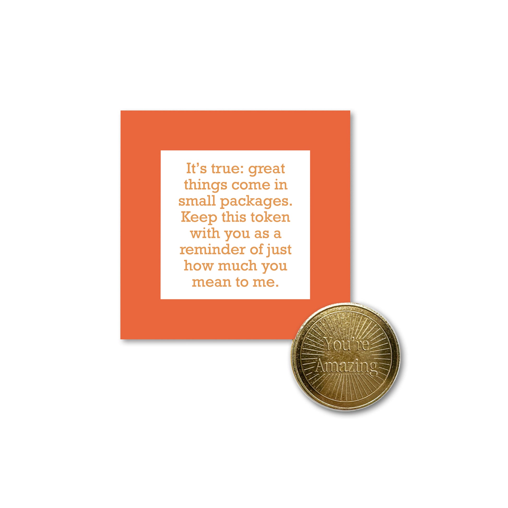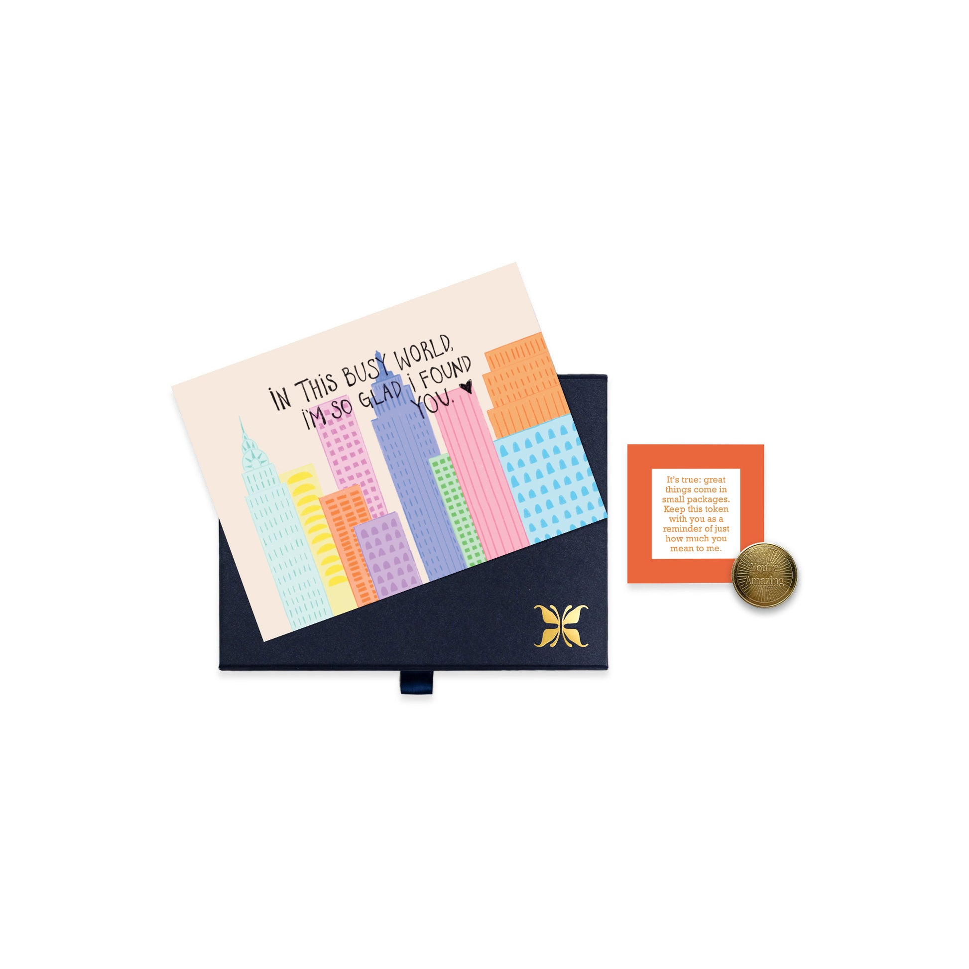 Each Token Moment includes a heavyweight flat greeting card with a vibrant full-color design and a brass-plated steel sentiment token, all housed in a magnetic gift box. It’s the perfect option for recognizing the universal, everyday moments or sending “just because.”