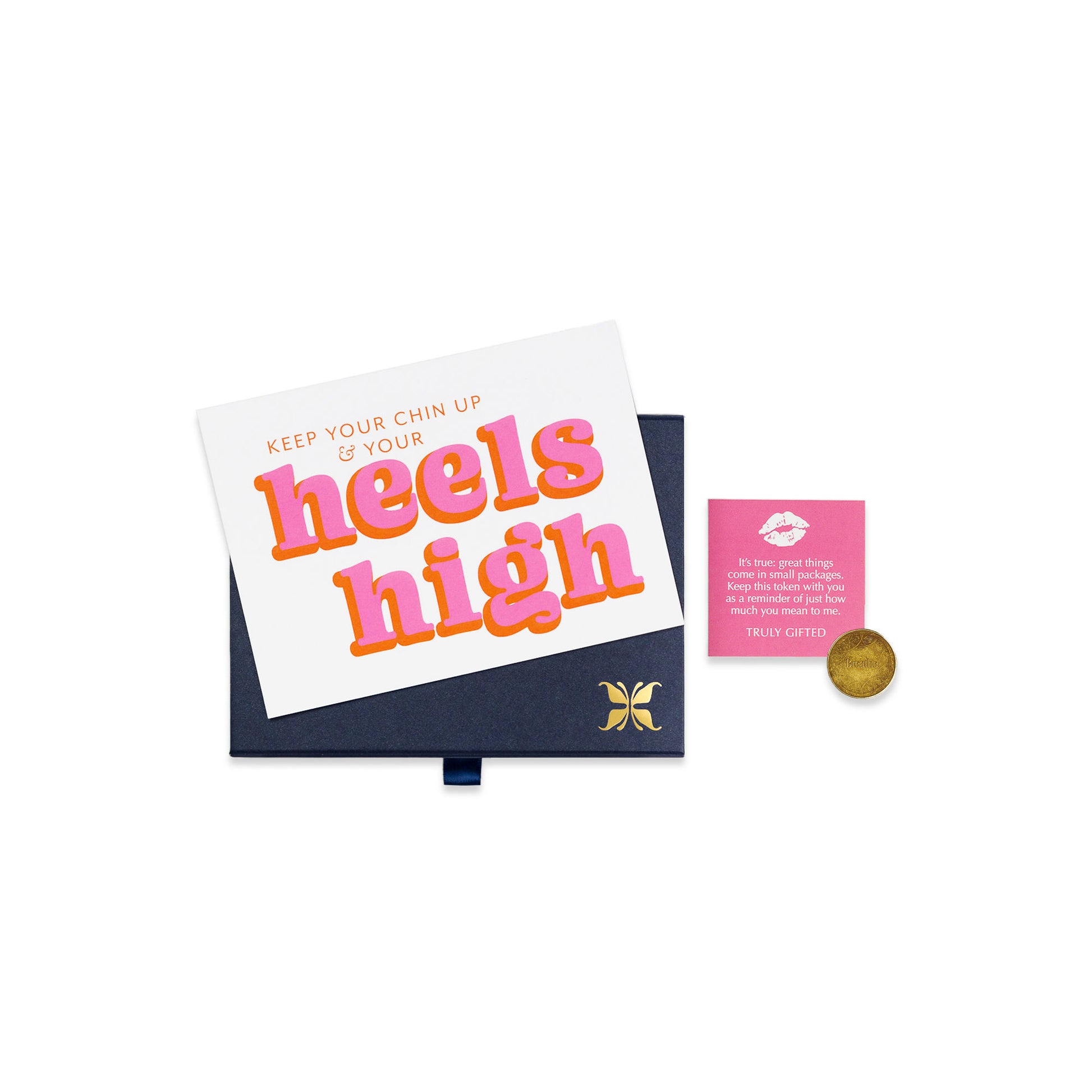 Each Token Moment includes a heavyweight flat greeting card with a vibrant full-color design and a brass-plated steel sentiment token, all housed in a magnetic gift box. It’s the perfect option for recognizing the universal, everyday moments or sending “just because.”