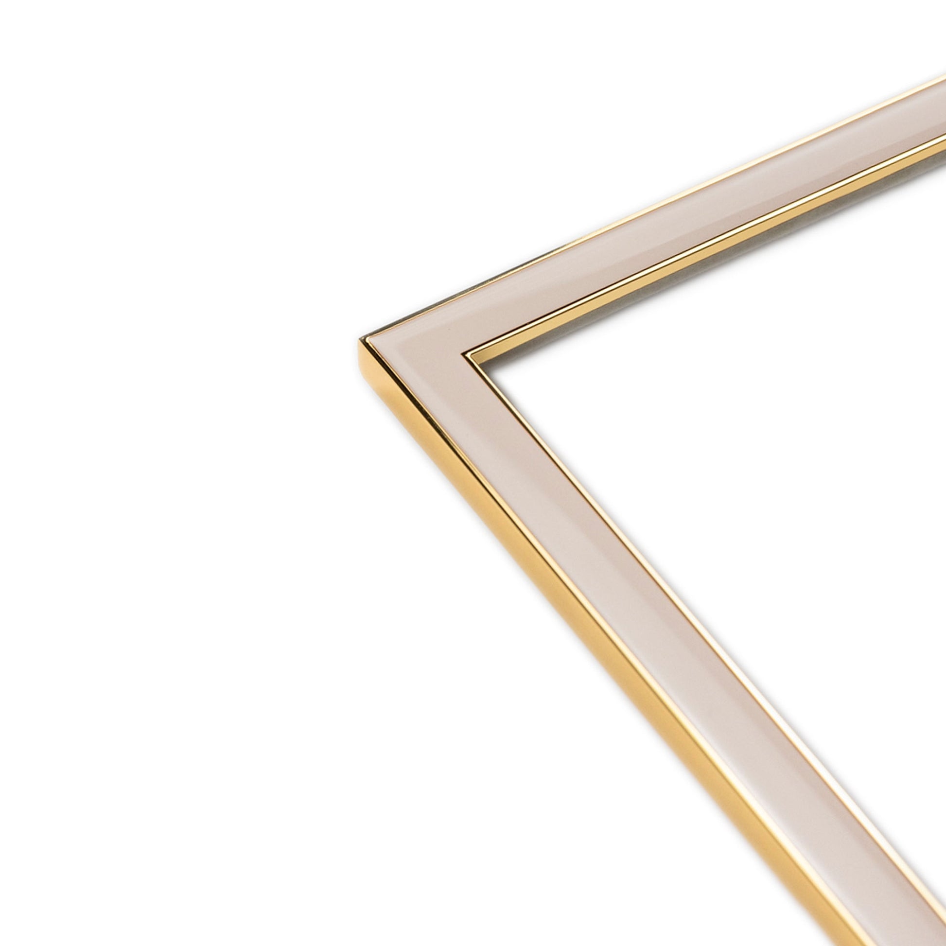 This modern tabletop picture frame is a stylish way to display your favorite memories. Featuring a pastel pink enamel ½” border finished with gold trim and gray velvet backing, this frame can accommodate both landscape and portrait photos.